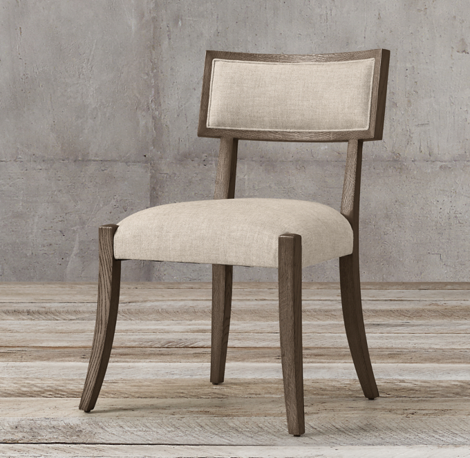 Our mila klismos upholstered dining chair embodies the timeless form with gracefully splayed legs, and expressively curved backs.